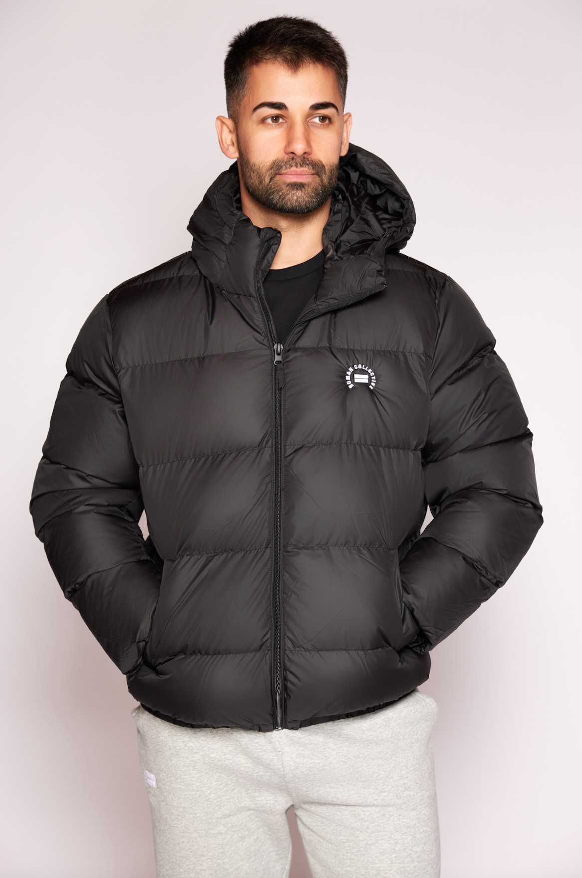 Our sustainable Men's Puffer Jacket in black features an adjustable, lined hood, inside zipped chest pocket, elasticated bottom hem and grosgrain straps to allow for easy hands free carrying.