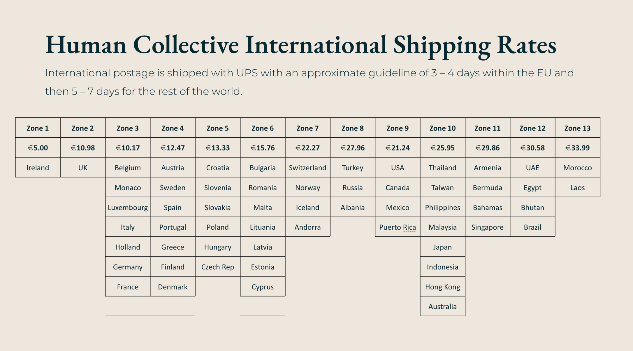 See below for international shipping rates. Please note, any orders sent to customers in the United Kingdom may incur the local relevant import duties, VAT and fees resulting from Brexit which may be collected when your package/s are delivered by the carrier.